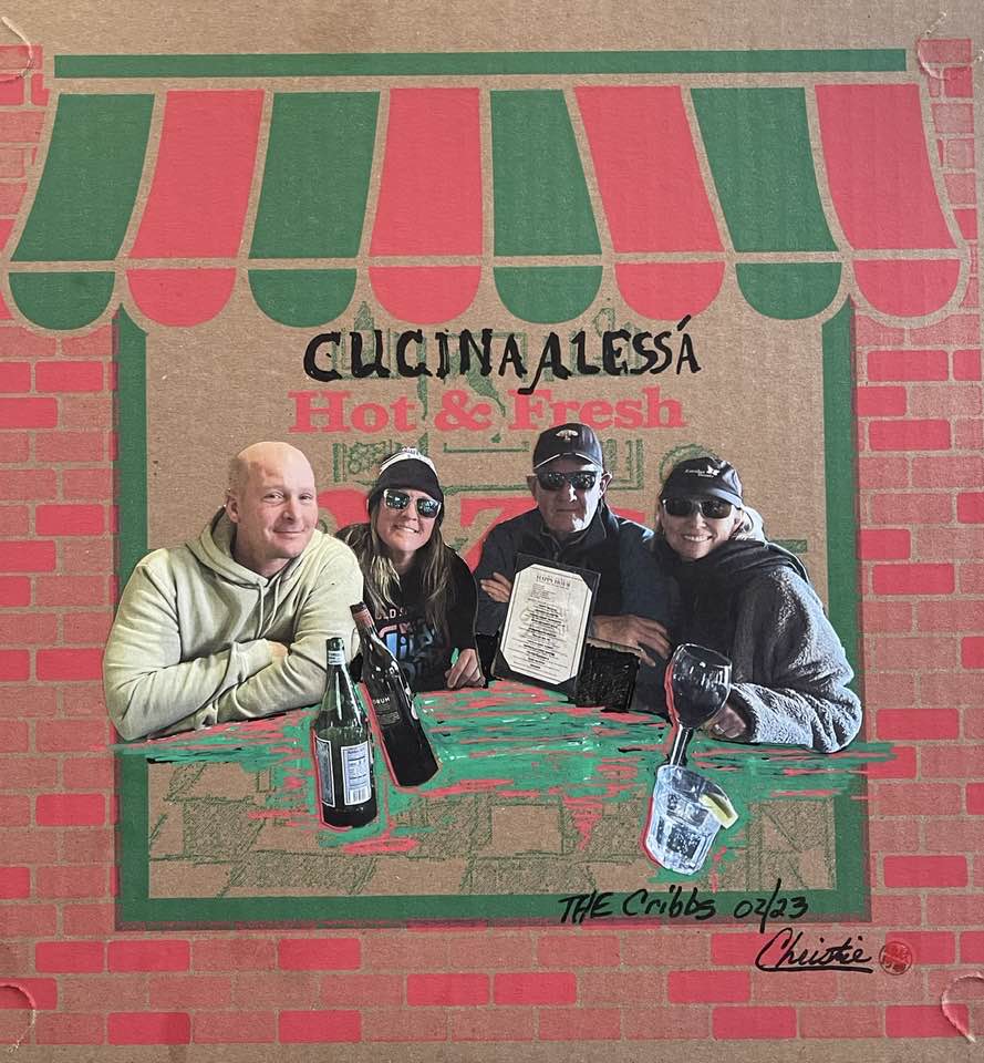 That’s right! Hot & Fresh with another Pizza Box Portrait! Happy Hour at Alessa’s. Eric, Audrey, David and moi—The Cribbs!
