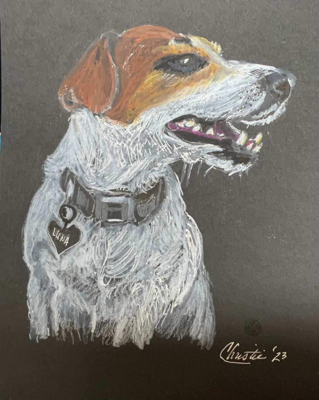 Finally finished a portrait of “Luna”, her parents are Carol and Andy Cribbs (my beloved in-laws). Done with watercolor crayons and finished the details with white Geli Pen.
