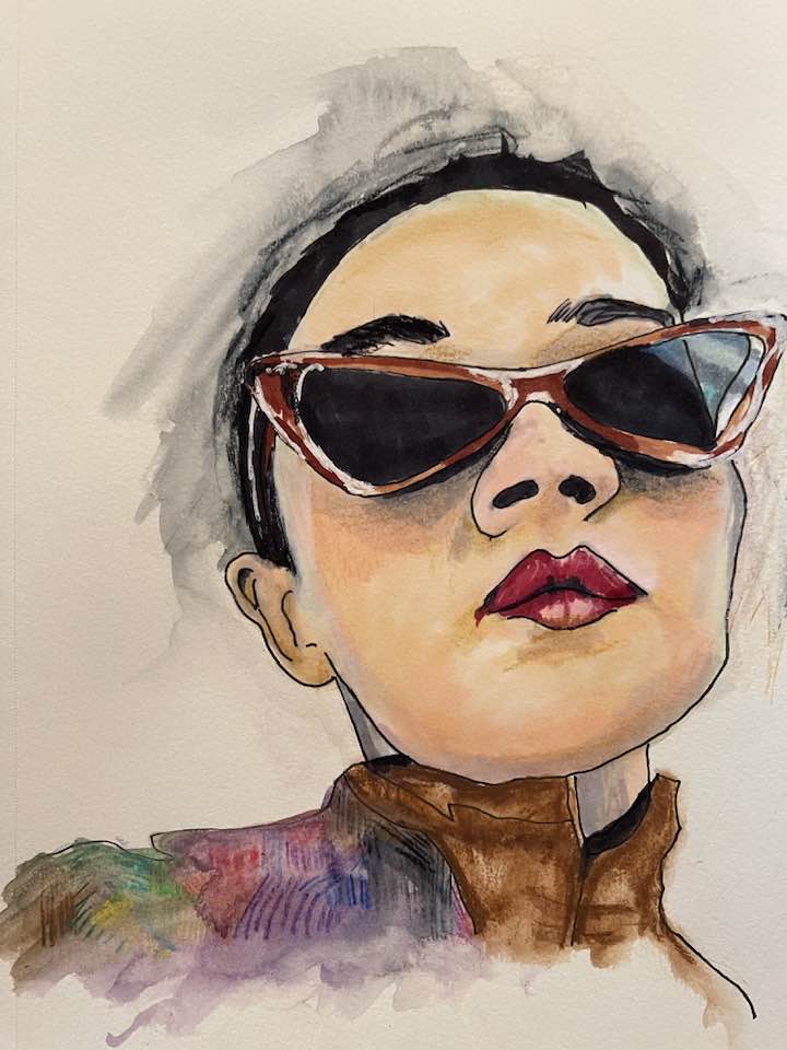 Class portrait of Jenell with sunglasses. Using Copics, pen and watercolor pencils.