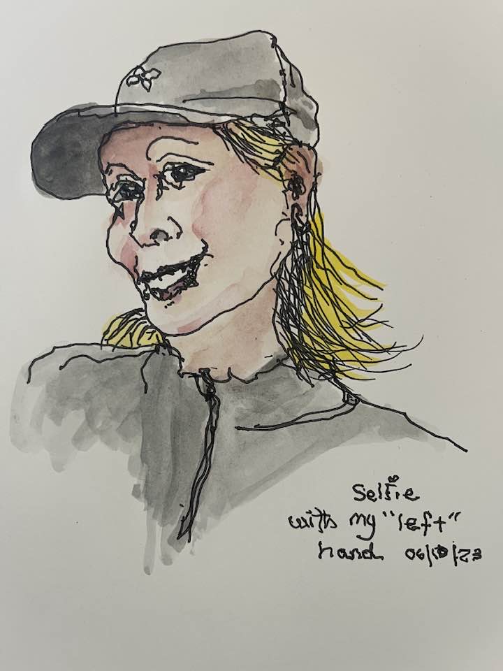 Contour drawing done left handed a selfie. Water color added (right handed). Fun art class today at #SketchbookSkool.