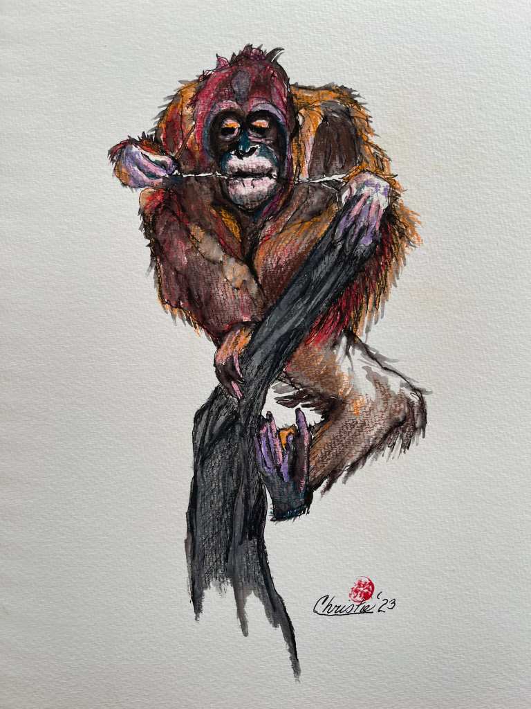 this sweet monkey in my Monkey see, Monkey sketch class. Dip pen continuous line ink with Posca colored pencils.
