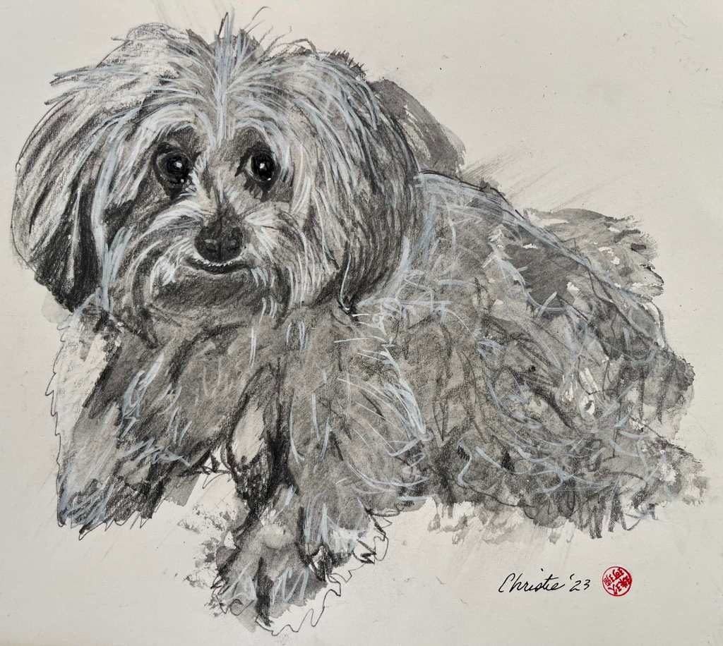 Last day of Dogust! Just finished this portrait for one of my best friends, Peggy’s recently departed Spanky. I personally have fond memories of Spanky. Done in liquid charcoal, graphite pencil and white Posca. RIP, sweet boy…