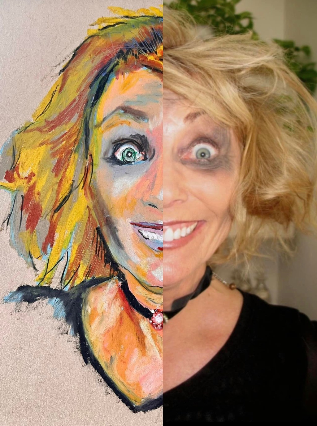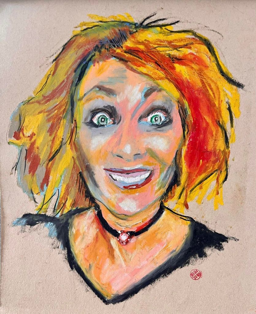 Selfietember Day 2. Theme: Surprise! Oil pastels done in “Matsu” style. From photo 2005, Hallowe’en Office party, and no, I had not been drinking…..actually it could be a mug shot?
