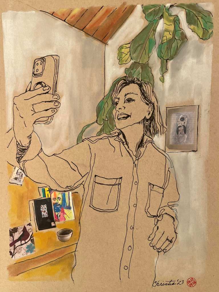 Ok, I missed a day for Selfietember 2023. Day 25. Selfie of me taking a selfie. How self absorbed can a person be? This is fountain pen, pastels, and collage on tan drawing paper. In My studio.