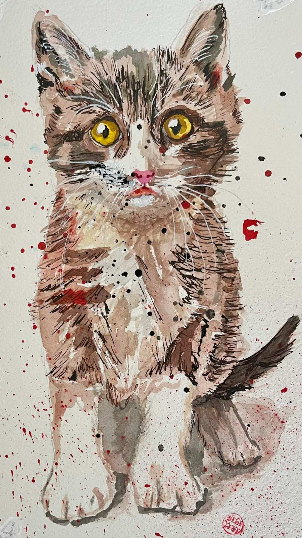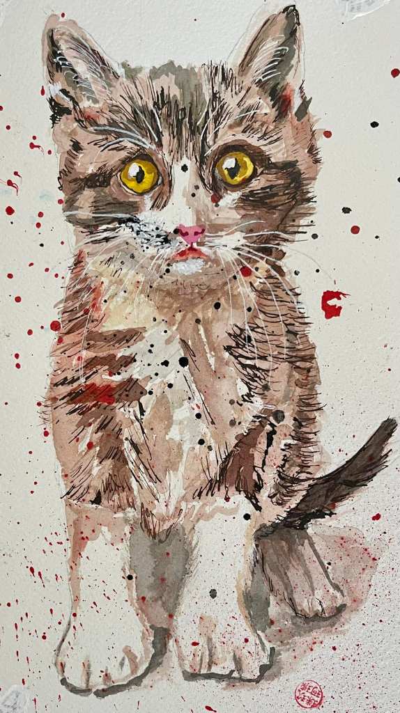 Catching up with #drawwithme, Danny’s kitten. Done in ink, brush and dip pen, on watercolor paper I used for practicing splatters !