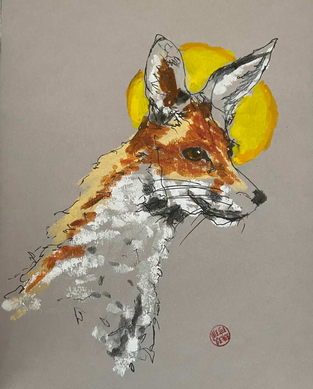 Class today with Artist Instructor #helenbirch and friend Craig. Urban foxes. Grey watercolor paper, Uniball Vision needle pen and Tempra sticks. #artistinresidence
